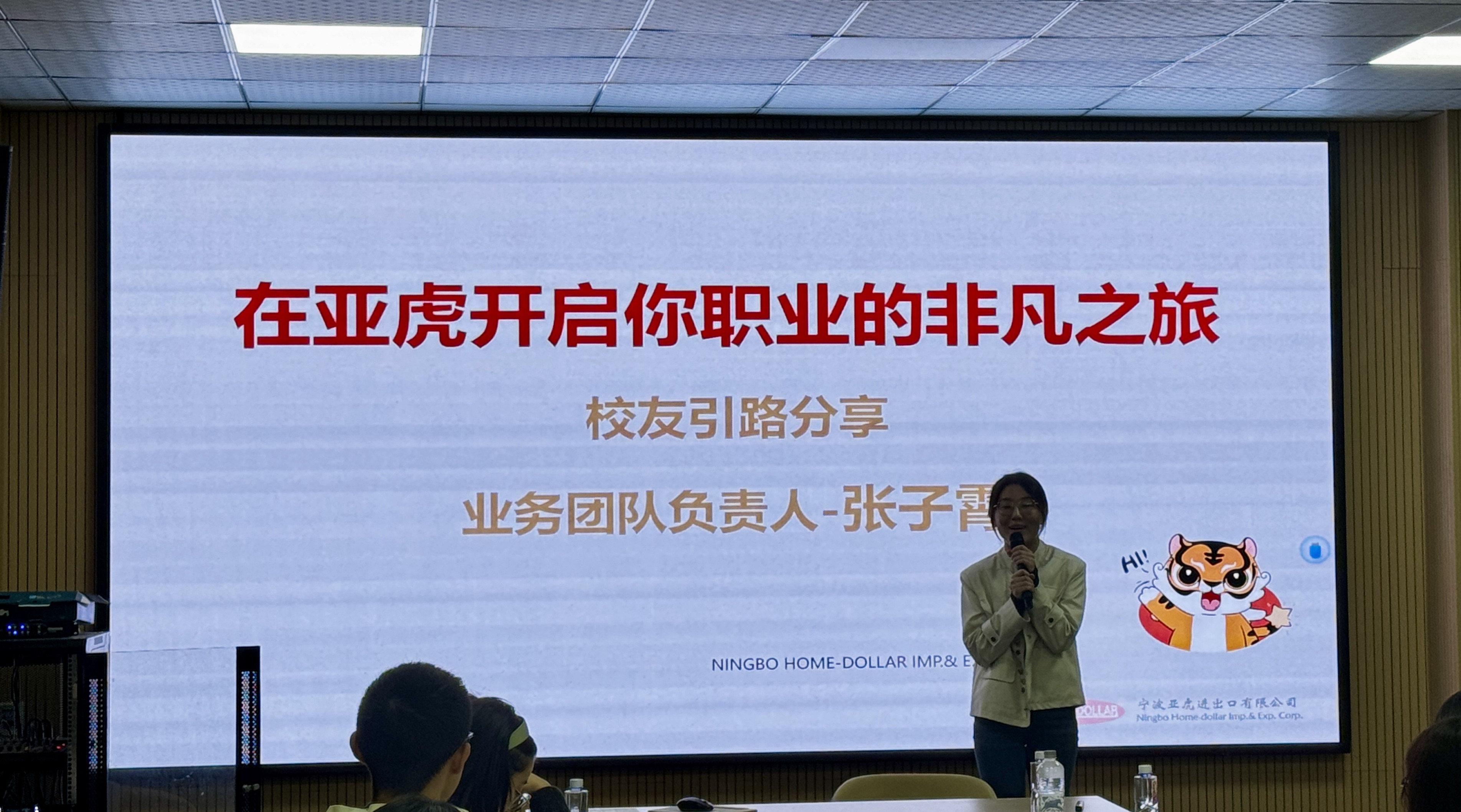 分享会上,亚虎人才总监杨秋芳女士对公司和本次招聘做了详细介绍。作为自1992年启航到如今的行业标杆,亚虎进出口实力亮眼,年出口额达8.5亿美元,连续十年保持超30%的复合增长率,业务覆盖全球60余个国家,拥有超10万+SKU的庞大产品矩阵,还坐拥8.7万㎡自有现代化园区,公司稳居中国民营外贸500强与宁波出口十强,在全球供应链领域占据重要地位,现汇聚近2000名精英共同发展。杨秋芳女士表示,亚虎进出口将带来多类岗位的招聘需求,为学子提供“挥洒才华的顶级平台”。