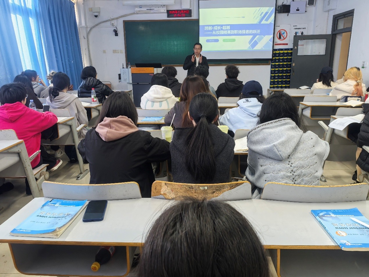 2025年11月28日,重庆商社集团、重庆百货人力资源总经理张泽军受邀到我院,为贸易经济专业的同学们开展了一场专题讲座。他以“跨越·成长·超越——从校园精英到职场强者的跃迁”为主题,带来了浓缩版的职场成长指南,为同学们搭建校园与职场的衔接桥梁、明确职业进阶方向提供了实用的经验参考。