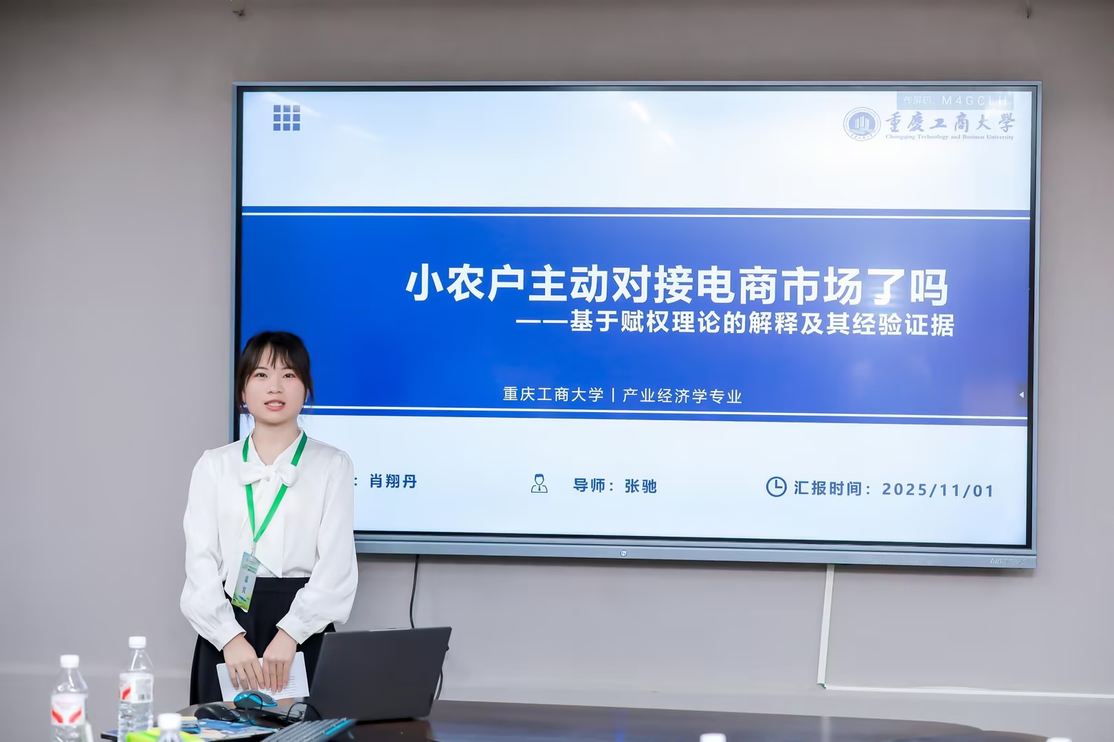 此次,肖翔丹同学汇报的论文主题是《小农户主动对接电商市场了吗?基于赋权理论的解释及其经验证据》,该成果是国家社会科学基金项目“乡村振兴背景下西部地区小农户对接电商市场的机制与路径研究”(编号22BGL263)的阶段性研究成果。该研究切中乡村振兴战略与数字乡村战略痛点,基于赋权理论研究了多维赋权对小农户电商市场参与决策行为的影响机制与效应。论文思路新颖、逻辑严谨、工作扎实,由此获得了现场点评专家与同行学者的肯定性评价。