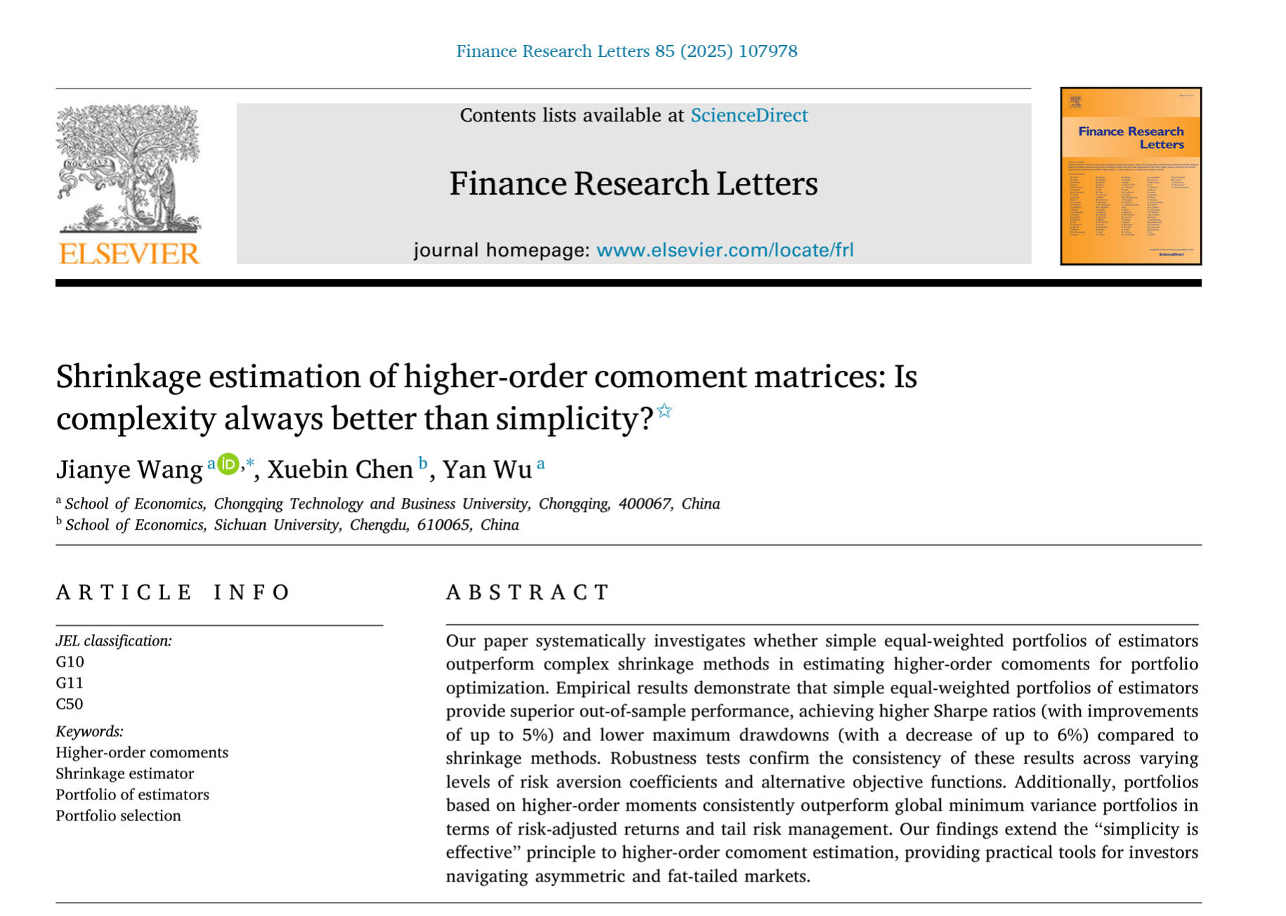 2025年7月23日,我院王建业老师以第一作者在SSCI2区、JCR 1区金融类期刊《Finance Research Letters》在线发表论文《Shrinkage estimation of higher-order comoment matrices: Is complexity always better than simplicity?》。