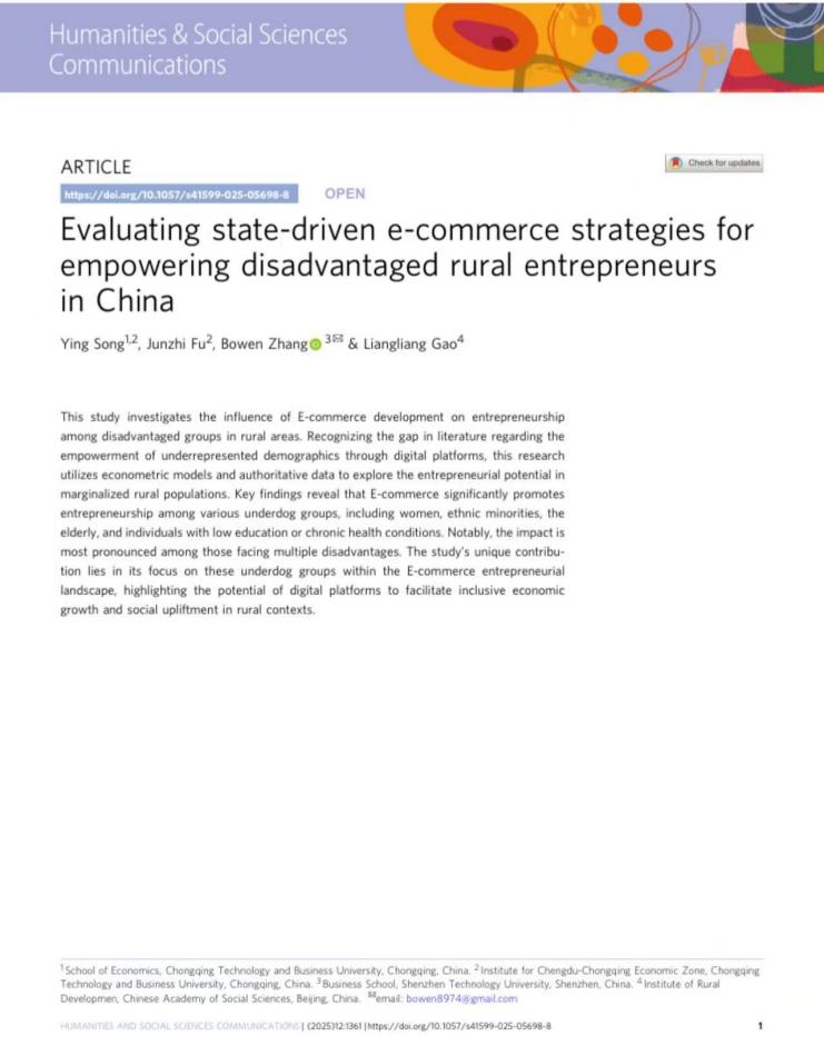 近日,我院宋瑛教授团队在Nature子刊《Humanities & Social Sciences Communications》发表题为“Evaluating state-driven e-commerce strategies for empowering disadvantaged rural entrepreneurs in China”的研究论文。Humanities& Social Sciences Communications为Nature旗下唯一人文社会科学类期刊,中国科学院一区刊物,被SSCI和A&HCI双索引,且在JCR分区中位列Q1,其期刊引用指数(JCI)在人文学跨学科领域的411种期刊中排名第1,社会科学跨学科领域的267种期刊中排名第2,是人文社科领域最具影响力的期刊之一。