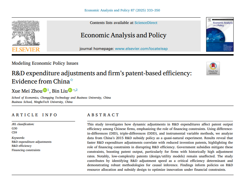 2025年9月,我院周雪梅老师以第一作者在SSCI 2区TOP、JCR 1区经济类期刊《Economic Analysis and Policy》发表题为《R&D expenditure adjustments and firm’s patent-based efficiency: Evidence from China》的论文。