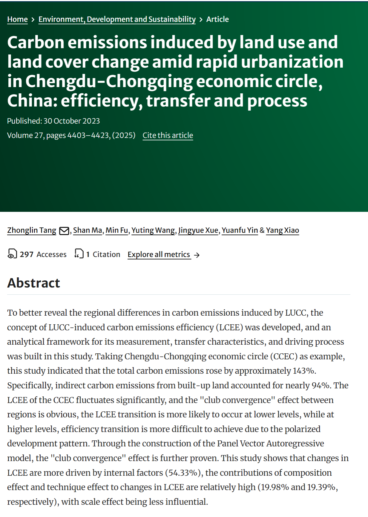 2025年2月,我院唐中林博士在SCI期刊《Environment, Development and Sustainability 》在线发表了题为《Carbon emissions induced by land use and land cover change amid rapid urbanization in ChengduChongqing economic circle, China: efficiency, transfer and process》的研究论文。